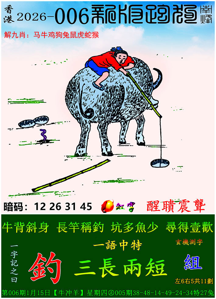 006期跑狗:【釣】牛背斜身,長竿稱釣。坑多魚少,尋得壹歡。玄機測字:《組》