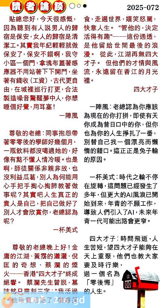 3.尊敬的老總晚上好!金庸的江湖、黃露的瀟灑、倪匡的奇想、蔡瀾的煙火一香港“四大才子”終成絕響。蔡瀾先生曾說,墓諾銘只需刻三字:“我活過”。他確實活透了:嚐遍美食,走遍世界,嬉笑怒罵,快意人生。”管他的,決定活得有趣”——這份通透,是他留給世間最後的浪漫。從此,江湖再無四大才子。但他們的才情與風流,永遠留在香江的月光裡。四大才子