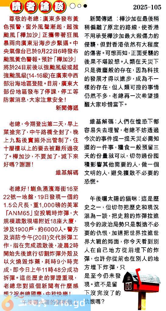 3.老總好!鯽魚湧濱海街16至22號一地盤,19日發現一個約1.5公尺長.重1,000磅的美軍「65」空投戰時炸彈,大規模疏散現場附近18座大廈,涉及1900户、約6000人。警方及消防今午(20日)交代拆彈工作,指在完成疏散後,凌晨2時開始先後進行切割炸彈外殼及以火燒毁炸藥,耗時9小時完成,即今日上午11時48分成功拆彈。這些歷史的罪證重現老總您對這個新聞有什麼感想?祝老總國慶、中秋快樂!午後曬太陽的貓咪敬上
