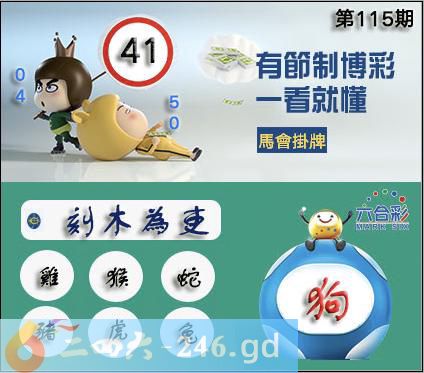 115期正版彩图挂:41 爆:狗 挂牌成语:刻木为吏 挂牌出肖:鸡猴蛇猪虎兔