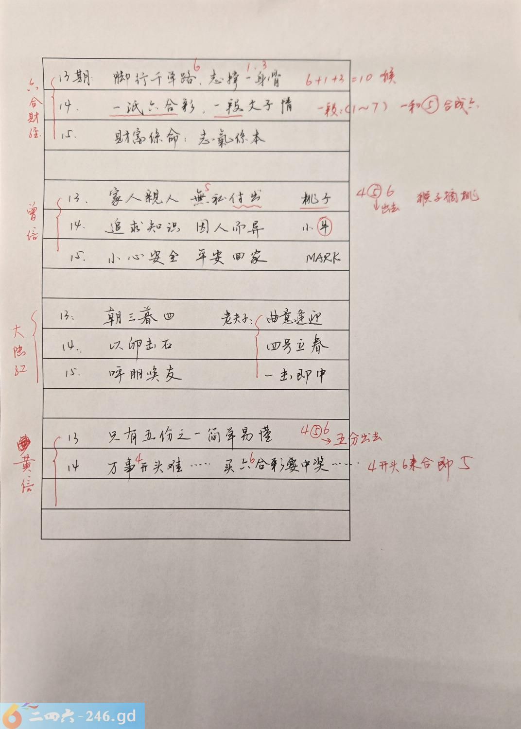 虽本人13期全军覆没、14期小防,但开奖后才知是自己思路狭隘,故总结发出,和各六友共同参考。六合彩只想从一两句话得出特码的,很难,在不同语言、句子中寻找最大共同点,这是本人的方法和思路。若有认为本人牵强附会而马后炮者,不喜勿喷,更不想与人争高低。毕竟各自命里多少横财,早已注定。