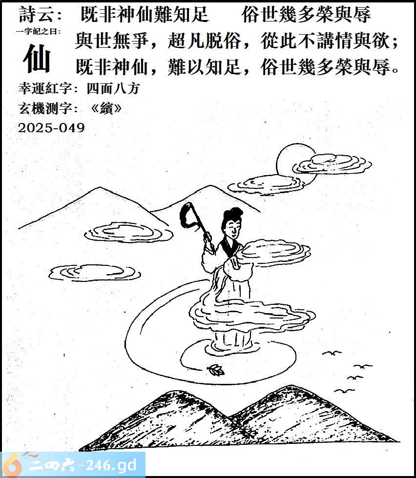 2025年5月3日049期虎(丙寅)(剑锋金) 049期:老版跑狗玄機一字記之曰:【仙】 詩云:既非神仙難知足俗世幾多榮與辱 與世無爭,超凡脱俗,從此不講情與欲; 既非神仙,難以知足,俗世幾多榮與辱。 玄機測字:《繽》 密圖詩:小小意思買二十 《記》:大紅喜字我來剪 特碼大小單雙句:邁開雙腳大步走 今期必中:孫尚香 049期:特碼歇后語 梦中游太空-----想入非非(飞飞) 049期正版四字梅花诗:粉红丝带。 049期火车头:烧伤马。诗:羊死龙伤,四书五经读一生。 049期香港第一手欲钱料:火。 049期曾道人说:“石头?” 049期另版四字梅花:四肢疲惫。 049期香港第一手欲钱料:欲钱看有头无尾的动物。 049期曾道人说:“女人为什么会羞耻” 049期:二字經:四經 049期:四川有特码 049期:智力金壤:讳莫如深 049期:信箱紅字:【窺見一斑】 049期:【暗碼:01-16-18-47】 049期:一語中特:【三言兩語】 發财玄機圖:盤曲錯節辨別明察圖中明牛紅綠 049期:藏寳圖 新:前日合溪能多诗 老:家随兵尽屋空存 禁:羊禁:0尾玄机字《眇》 2025年049期【生活幽默】版 〖經商之道〗 某個賣槍的因鎮上治安太好而賣不出槍。于是他不得已又兼賣另一樣東西--喇叭!一天,某人買了個喇叭結果第二天就有三四個人來買槍。過兩天,他又賣出喇叭,于是第二天又有人來買槍基于好奇心的驅使下,他問其中一位買槍的客人爲什麽買槍。客人說:“我家對面那個昨天吹了一天的喇叭,我全家都快受不了了!所以,我才來買槍。”