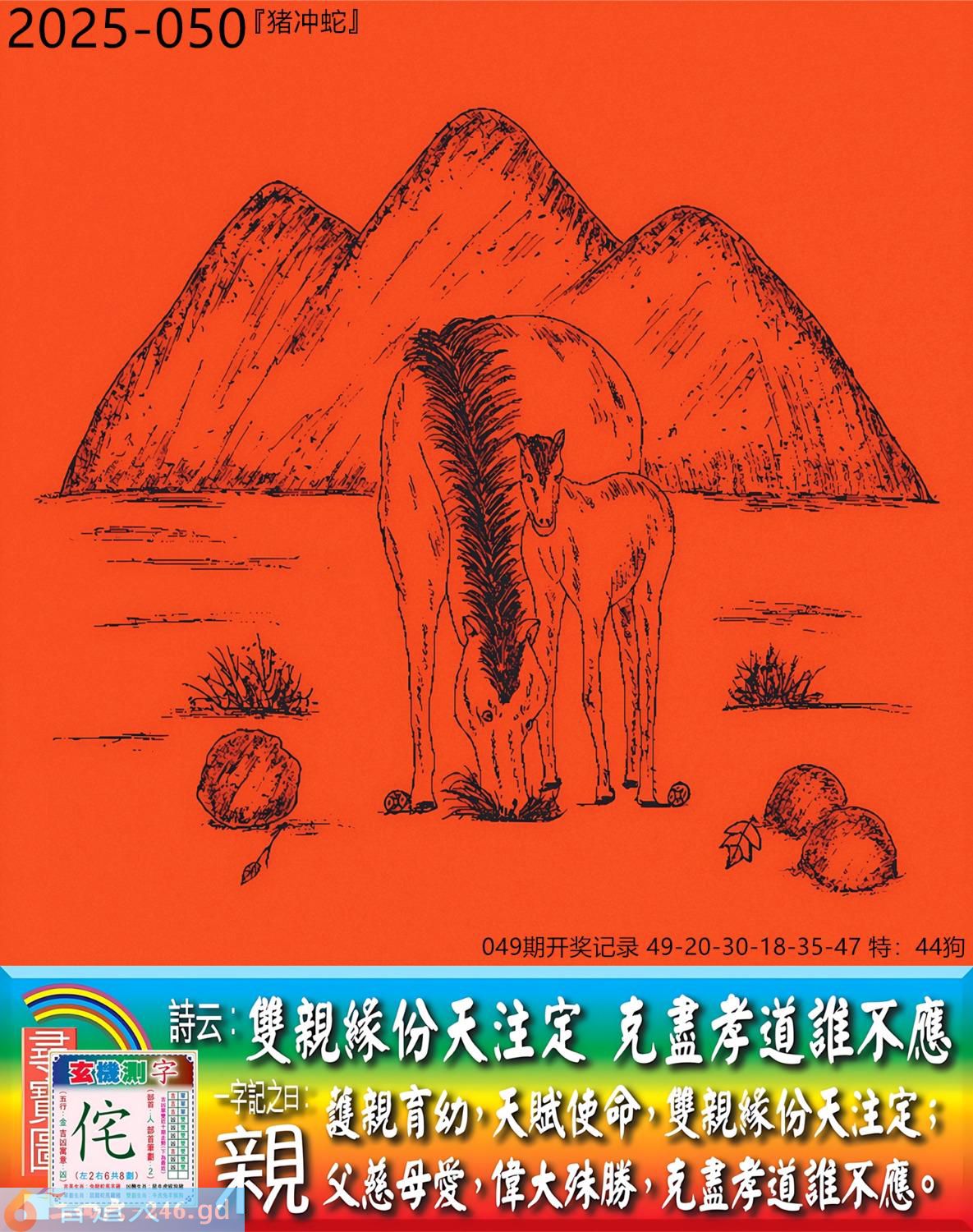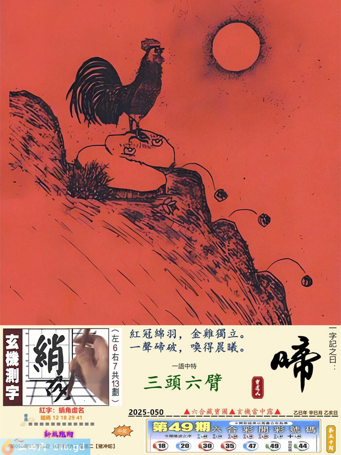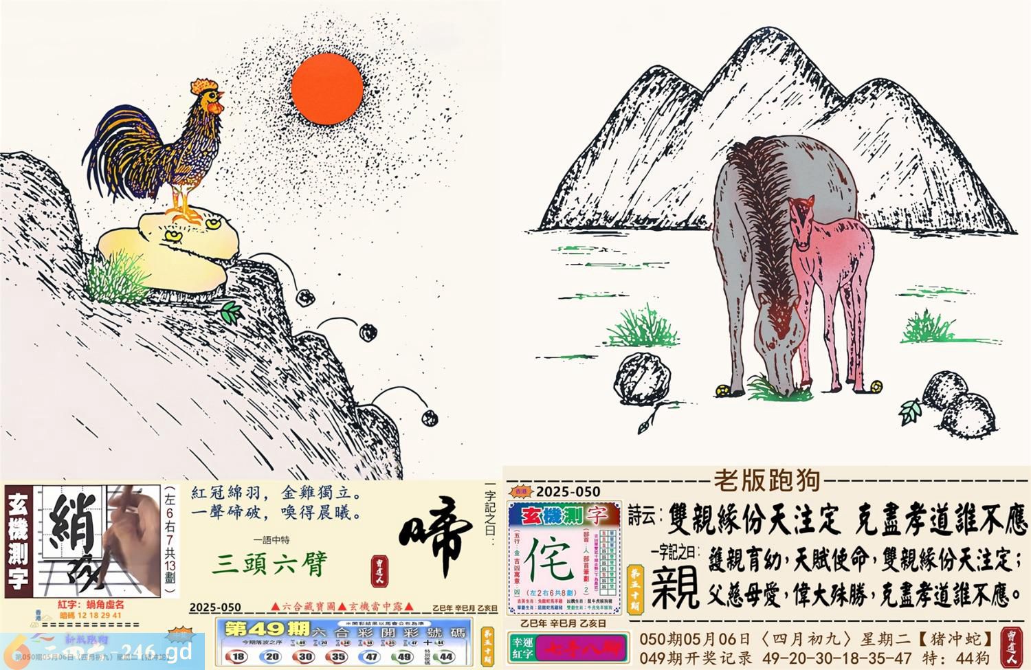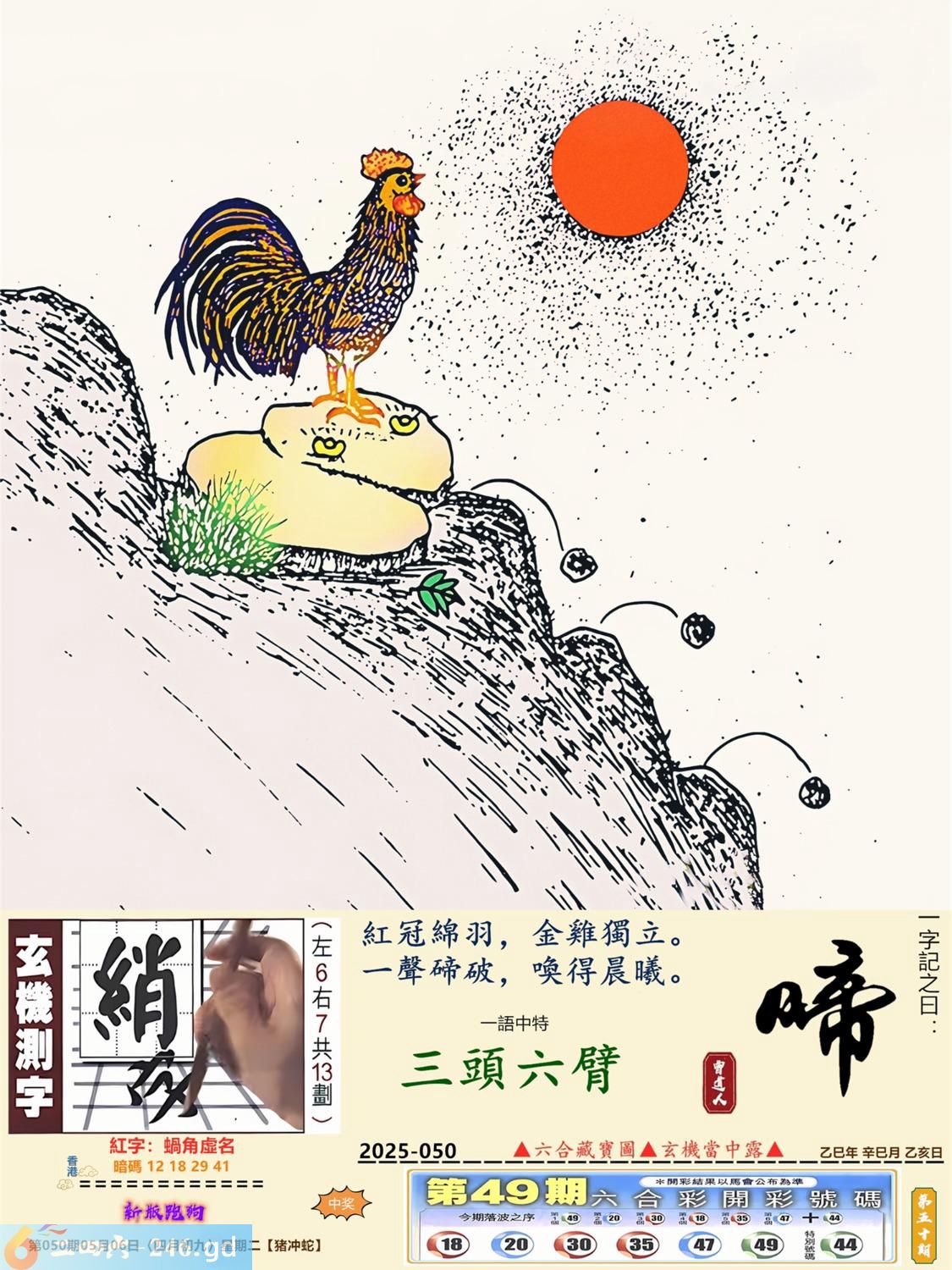 2025年5月6日050期蛇(己巳)(山头火) 050期:老版跑狗玄機一字記之曰:【親】 詩云:雙親緣份天注定克盡孝道誰不應 護親育幼,天賦使命,雙親緣份天注定; 父慈母愛,偉大殊勝,克盡孝道誰不應。 玄機測字:《侘》 密圖詩:榮華富貴享不盡 《記》:姑息養奸翻賊船 特碼大小單雙句:特碼不是凡夫采 今期必中:劉備 050期:特碼歇后語 麦粒掉到太平洋-----沧海一粟 050期正版四字梅花诗:一步登天。 050期火车头:烧伤猴。诗:虎龙狗伤,三七一八比短长。 050期香港第一手欲钱料:滴水不漏。 050期曾道人说:“颠三倒四?” 050期另版四字梅花:四脚朝天。 050期香港第一手欲钱料:欲钱看北京市都的建设年代。 050期曾道人说:“女人二十以上出门经常会带什么东西”? 050期:二字經:一下 050期:扫把是特码 050期:智力金壤:众矢之的 050期:信箱紅字:【蝸角虛名】 050期:【暗碼:12-18-29-41】 050期:一語中特:【三頭六臂】 玄機發財圖:圖中明鼠紅藍 050期:藏寳圖 新:蝶粉蜂黄大小乔 老:倒得前头山脚尽 禁:兔禁:4尾玄機字《袭》 2025年050期【生活幽默】版 〖私房銭不見了〗 同事上班後一臉的無奈。我上去問他:“怎麽了?”同事:“别說了,放在書房裏的私房錢不見了。”我笑道:“在你家,還會有誰,肯定就是你家的她拿了啊!”同事道:“就怕不是她。”我問他:“不是她還會是誰?”同事説:“就怕是隔璧的老王,我藏錢的地方跟他一樣,也是在書房的第二層書架上。”