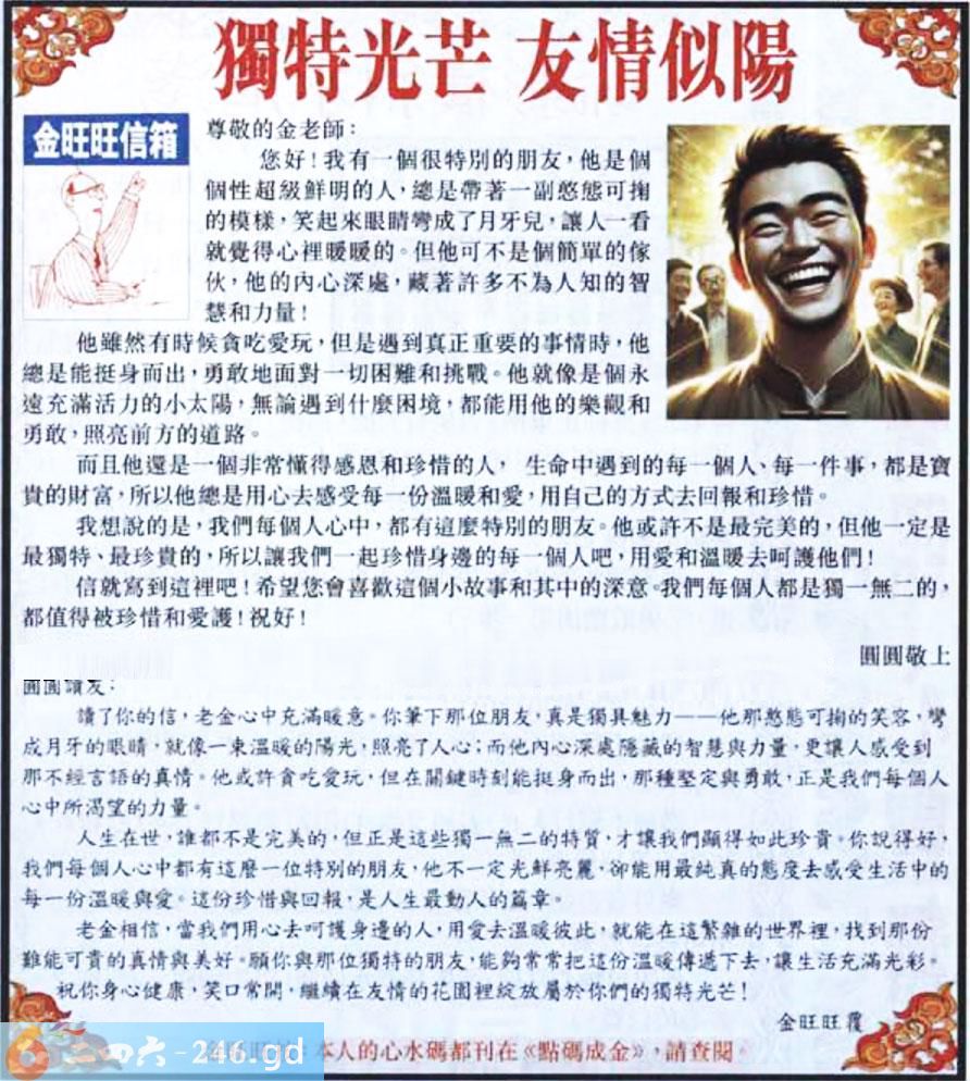 2025055期055期:金旺旺信箱彩民推荐→→《獨特光芒 友情似陽》