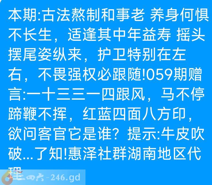 本期:古法熬制和事老养身何惧不长生,适逢其中年益寿摇头摆尾姿纵来,护卫特别在左右,不畏强权必跟随!059期赠言:一十三三一四跟风,马不停蹄鞭不挥,红蓝四面八方印,欲问客官它是谁?提示:牛皮吹破...了知!惠泽社群湖南地区代理