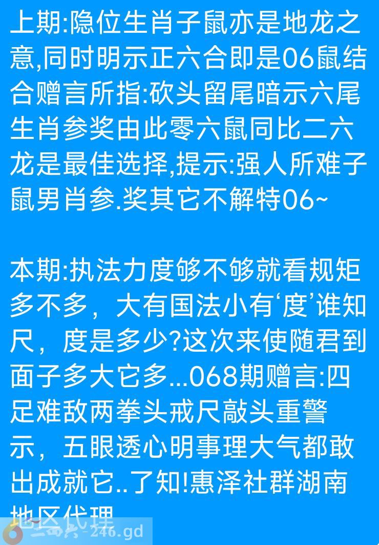 上期:隐位生肖子鼠亦是地龙之意,同时明示正六合即是06鼠结合赠言所指:砍头留尾暗示六尾生肖参奖由此零六鼠同比二六龙是最佳选择,提示:强人所难子鼠男肖参.奖其它不解特06 本期:执法力度够不够就看规矩多不多,大有国法小有‘度’谁知尺,度是多少?这次来使随君到面子多大它多...068期赠言:四足难敌两拳头戒尺敲头重警示,五眼透心明事理大气都敢出成就它..了知!惠泽社群湖南地区代理
