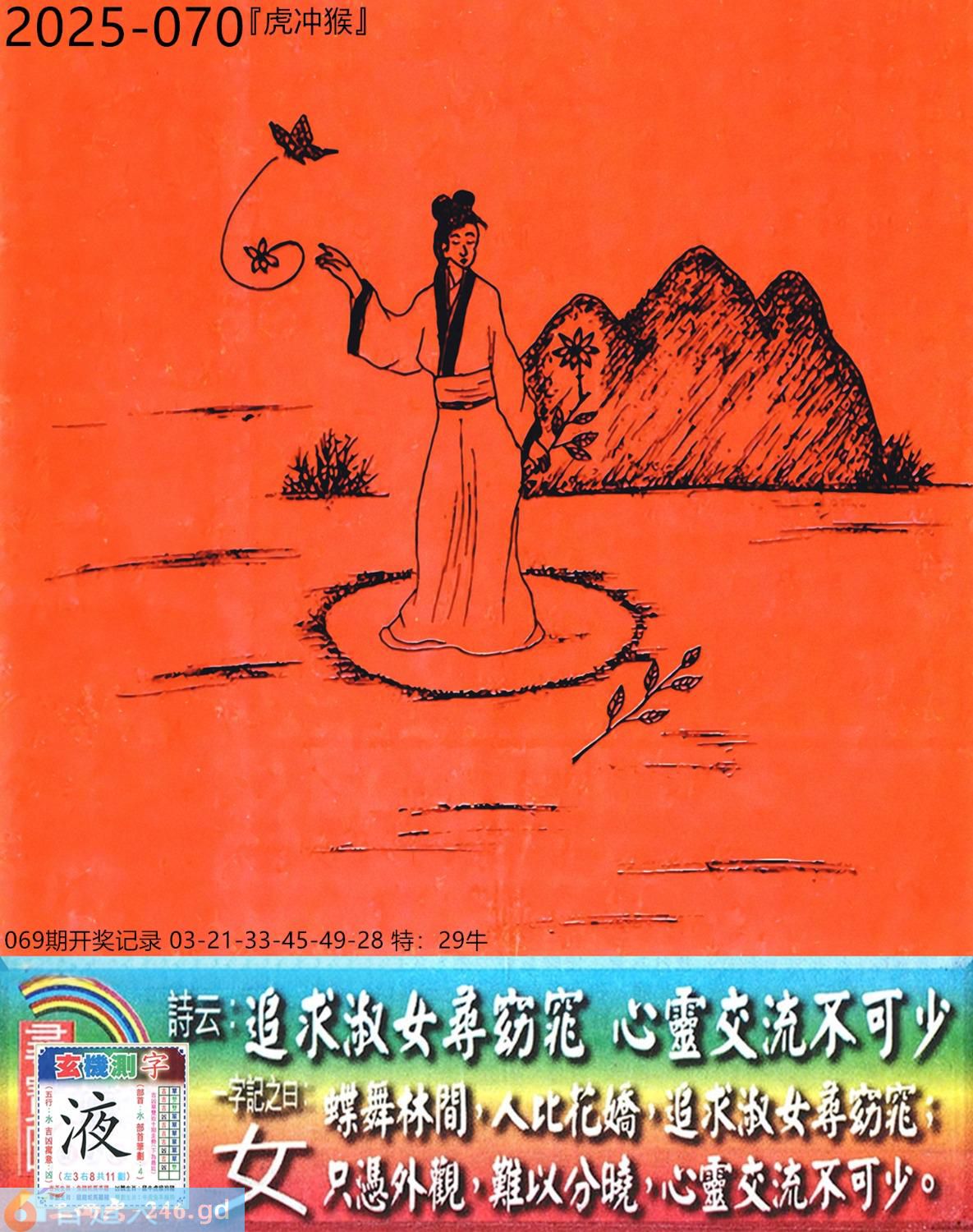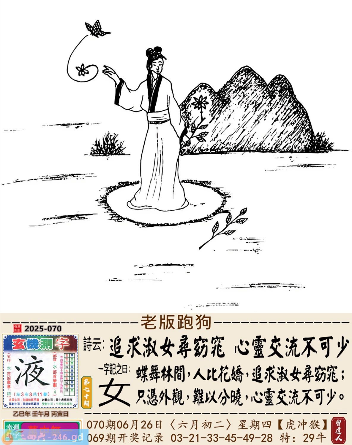 2025年6月26日070期侯(庚申)(炉中火) 070期:老版跑狗玄機一字記之曰:【女】 詩云:追求淑女尋窈窕,心靈交流不可少。 蝶舞林間,人必花嬌,追求淑女尋窈窕; 只憑外觀,難以分曉,心靈交流不可少。 玄機測字:《液》 密圖詩:千金難買存光陰 記:不三不四是無賴 特碼大小單雙句:七上八下心惶惶 今期必中:馬超 070期:特碼歇后語 孤树上知了-----自鸣得意 070期正版四字梅花诗:三好学生。 070期火车头:烧伤兔。诗:牛死羊伤,家喻户晓最忠心。 070期香港第一手欲钱料:红?。 070期曾道人说:“有雨?” 070期另版四字梅花:七十二变。 070期香港第一手欲钱料:欲钱找世界最高楼。 070期曾道人说:“为什么现代的人喜欢赌博”? 070期:二字經:朋友 070期:市长是特码 070期:智力金壤:文不加点 070期:信箱紅字:【恐後爭先】 070期:【暗碼:01-21-38-49】 070期:一語中特:【一五一十】 發財玄機圖:憨狀可掬圓潤滚滚圖中明豬紅綠 070期:藏寳圖 新:渠自好丑吾何必 老:白首相逢泪满缨 禁:马禁:4尾玄機字《刘》 2025年070期【生活幽默】版 〖表現很好〗 有一個精神病患者救了一個落水 者。 院長非常高興,對這個精神病患者 說:“這次你救了一個落水的人,表現 很好,但不幸的是他不知道什麽是原因 又上吊自殺了。" 精神病很得意的說:“是我把他挂 起來要晾幹的!”