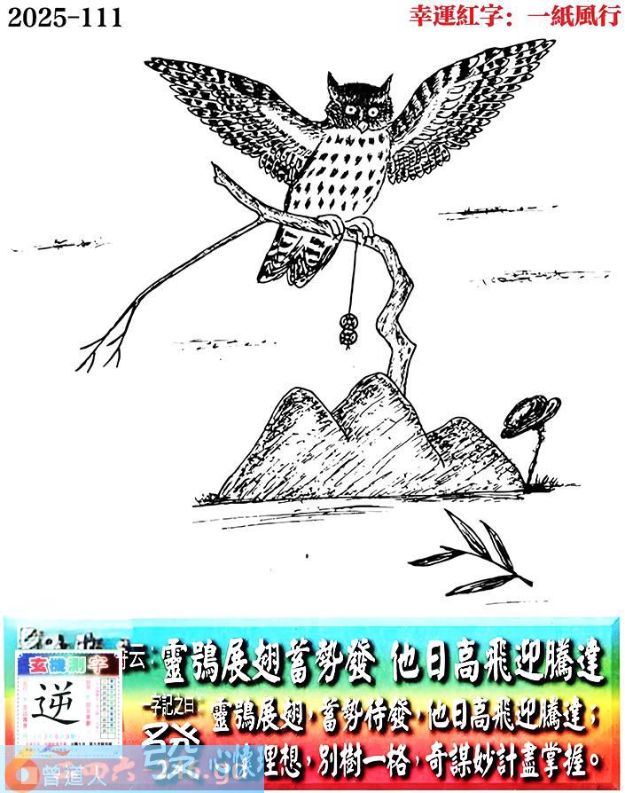 111期老版跑狗一字記之曰:【發】 詩雲:靈鴞展翅蓄勢發,他日高飛迎騰達。