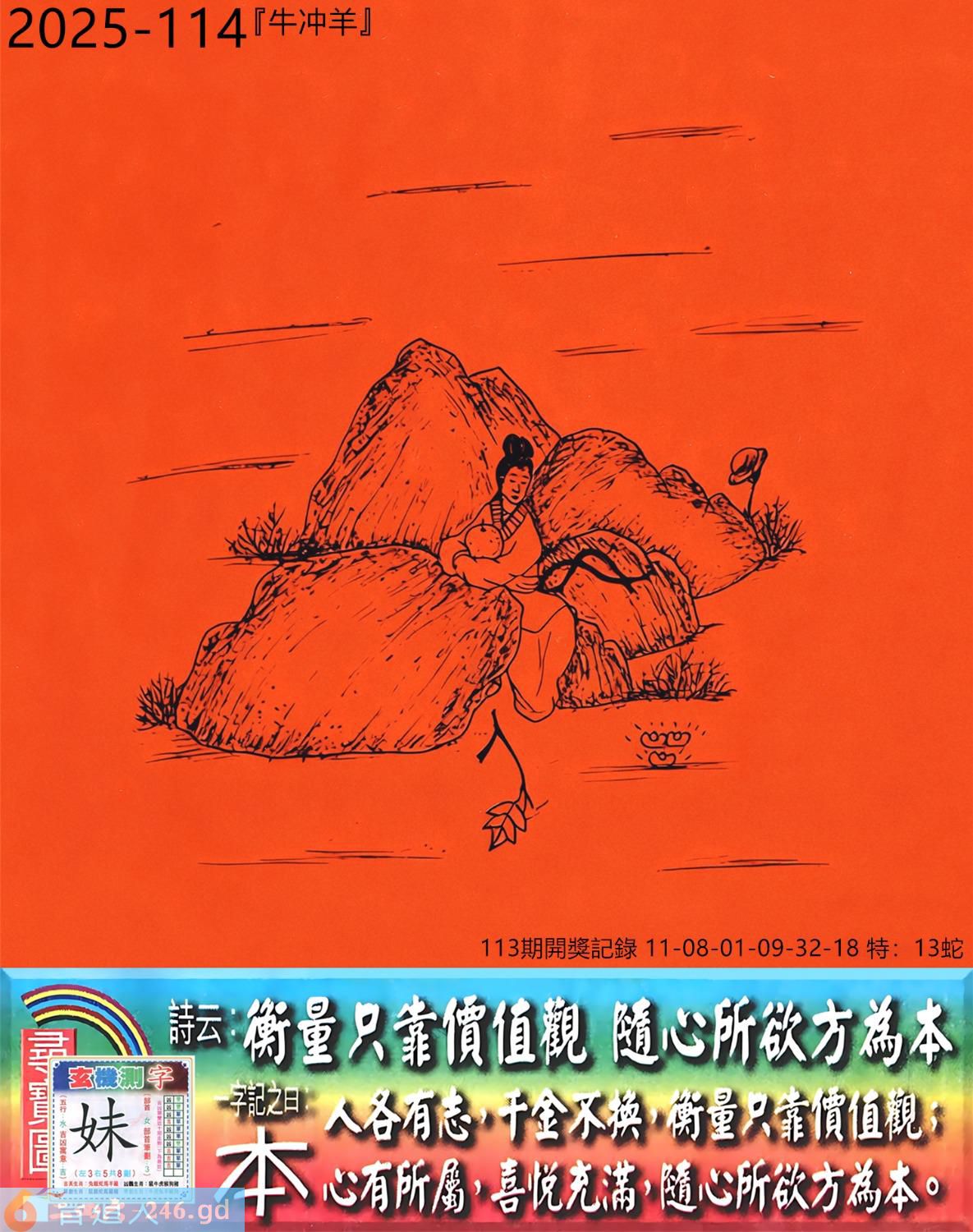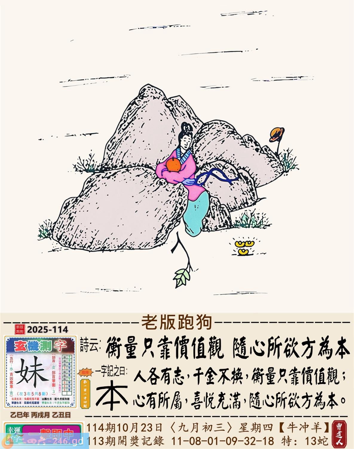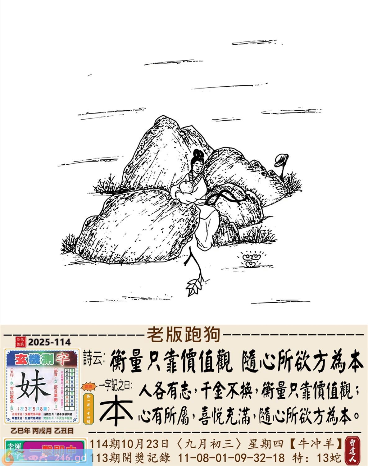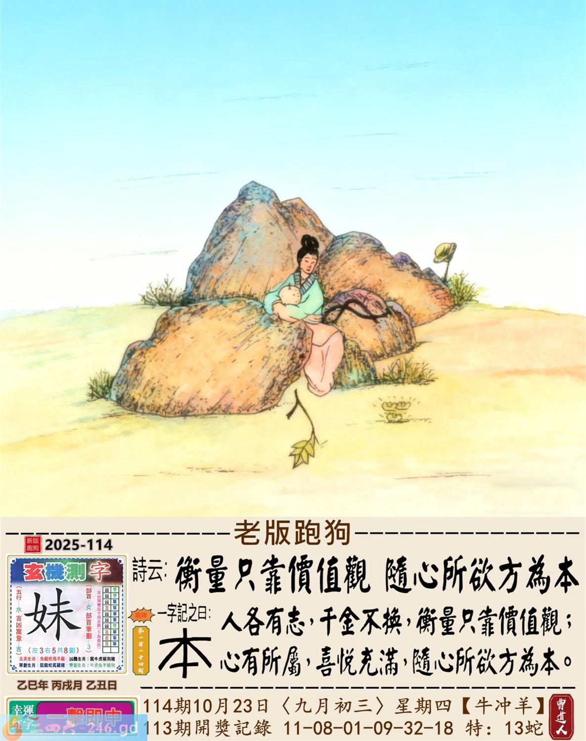 2025年10月23日114期羊(己未)(海中金) 114期:老版跑狗玄機一字記之曰:【本】 詩云:衡量只靠價值觀隨心所欲方為本 人各有志,千金不換,衡量只靠價值觀; 心有所屬,喜悅充滿,隨心所欲方為本。 玄機測字:《妹》 密圖詩:酒足飯飽去按摩 《記》:同桌對座賽象棋 特碼大小單雙句:一窩鳥蛋有六個 今期必中:趙雲 114期:特碼歇后語 东郭先生救狼-----好心不得好报 114期正版四字梅花诗:说三道四。 114期火车头:烧伤羊。诗:猪死鼠伤,一八开出数必奇。 114期香港第一手欲钱料:火。 114期曾道人说:“玉柴?” 114期另版四字梅花诗:问道于盲。 114期香港第一手欲钱料:欲钱解路边算卦。 114期曾道人说:“为什么会有这么多的人群吗”? 114期:二字經:想嗎 114期:路灯是特码 114期:智力金壤:飞龙在天 114期:信箱紅字:【心生一計】 114期:【暗碼:02-25-34-38】 114期:一語中特:【三從四德】 發财玄機圖:温和吉祥寬容仁厚圖中明羊紅綠 114期:藏寳圖 新:不驾蒲轮佐禹汤 老:闲上山来看野水 禁:狗禁:9尾玄机字《沸》 2025年114期【生活幽默】版 〖聊天〗 一位中國人和一位菲律賓人在酒吧聊天。中國人說:我認爲菲律賓就像一個步入青春期的躁動少年,而黄岩島正是他在家中的抽屉裹翻到的成人影碟。 菲律賓人問道:你的意思是説菲律賓已經很硬了,可以開始動手了? 中國人輕輕吐了口烟,一字一句地說:我是説那玩意是你爹的,你再敢看一眼信不信你爸打死你?