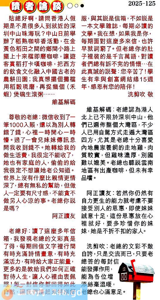 第一二五期讀者論談 1.貼總好啊,請問香港人假期是不是很多人到就近的深圳中山珠海玩?中山日前舉辦了稻熟咖啡香活動,在金黃色稻田之間的鄉間小路上擺上十來檔即磨咖啡,讓遊客賞稻打卡嘆咖啡,把西方的飲食文化融入中國古老的農耕田園;我真想擺個攤檔用稻轂現磨,再捉幾個(禾蝦)煲碗生滾粥......維基解碼 〖維基解碼〗:老總認為港人北上已不限於深圳中山,他們已遍布整個大灣區,不少人已用自駕方式走遍大灣區四方,尤其是老總十分喜愛內地農家養飼的走地雞,肉質較實,但雞味濃厚,別國難以媲美。老總也聽說雲南地區有出產咖啡,但未有幸品嚐。 2.尊敬的老總:微信收到了一筆1000入賬,還以為別人轉錯了錢,心裡一時開心一時懵。過了一會兒妹妹傳訊息問我收到錢不。她轉給我的做生活费,我很定不能收了,她也有家庭的人,偷偷的給我很定不想讓她老公知道。世界上沒有什麼比親情更情深了,總有無私的幫助,但做人定要有尺寸感,不能貪不做另人心涼的事。老總你說是嗎?阿正讀友 〖阿正讀友〗:若然你仍然有自力更生的能力就考慮不要接受別人的恩惠,即使妹妹誠意十足,這份恩惠放在心裡就好,要多珍惜你的妹妹,她是不折不扣的家人。 3.老總好:讀了這麼多年信箱,我發現老總的文彩真是了得,每期回信文字裡行間有時充滿詩情畫意,有時充滿活力,有時給大家正能量,更多的是教給我們如何正確對待人生,讓人心裡由衷佩服!每一封信你都回得如此自然,讓我們讀起來特別舒服,與其說是信箱,不如說是一本文學雜詵,每期必讀的文學。我在想,如果我是你,每期面對這麼多來信,也許早就詞窮了。但老總你的肚子裡装的是千言萬語,對讀者們總有訴不完的情懷...在此真誠的說聲:您辛苦了!學生有幸與創富網結緣15週年,感恩有您的陪伴!洗剪吹敬 〖洗剪吹〗:老總的文彩不敢自誇,只是交流而已,只要老總答的每封信能發揮作用,能為各位增添絲毫溫暖,老總也心滿意足。
