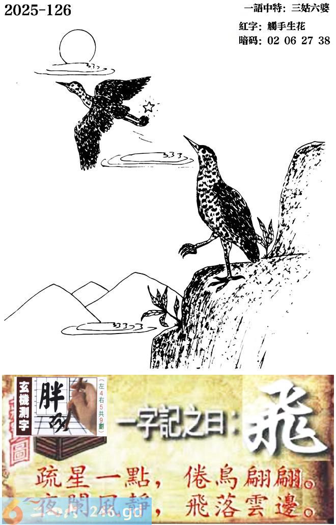 126期跑狗一字記之曰:【飛】 疏星壹點,倦鳥翩翩。 夜闌風靜,飛落雲邊。 玄機測字:《胖》 一語中特:三姑六婆