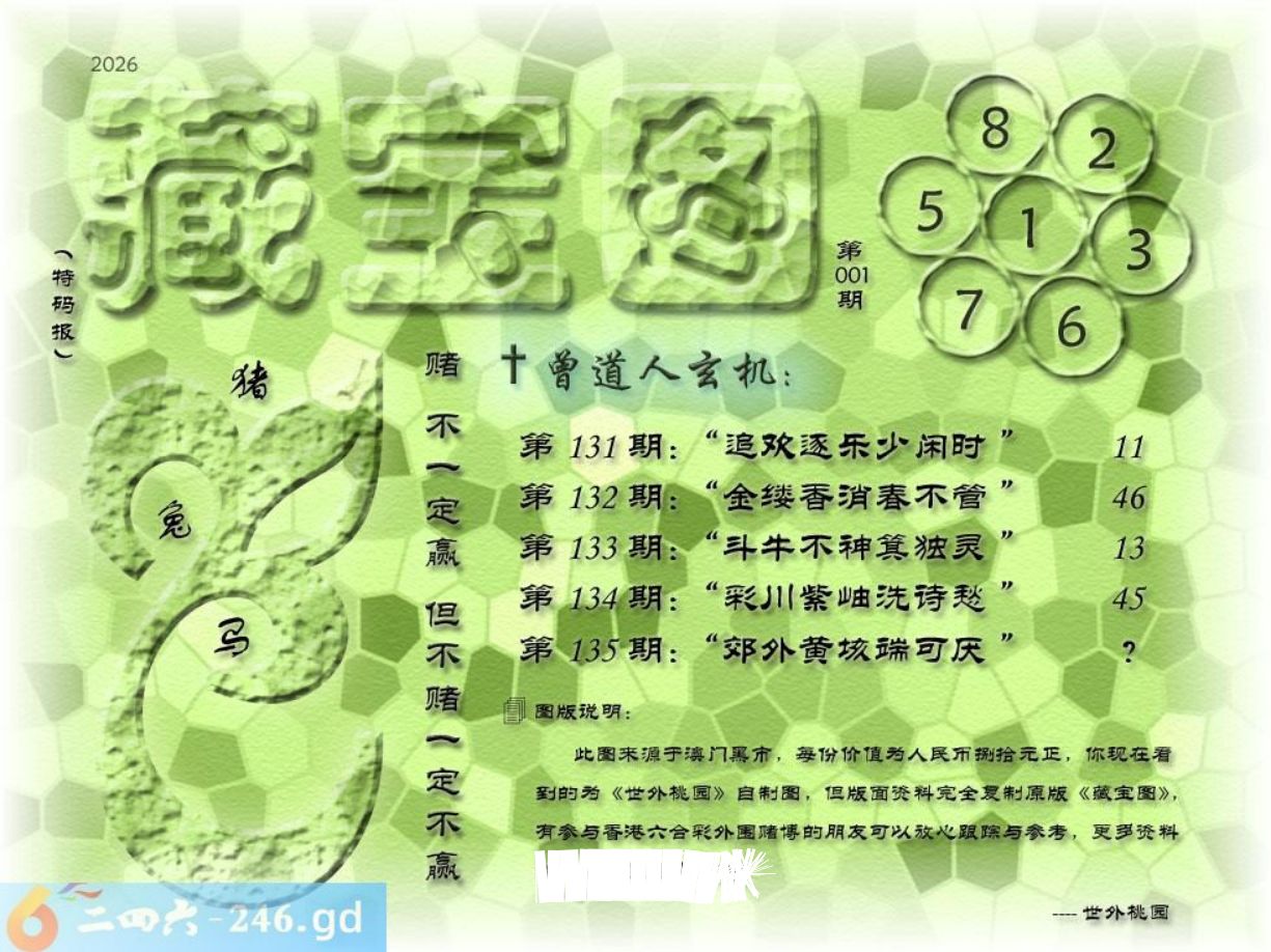 001期藏寶圖 新:郊外黄垓端可厌 老:晴街春色香车立 禁:虎禁:0尾玄機字:《育》