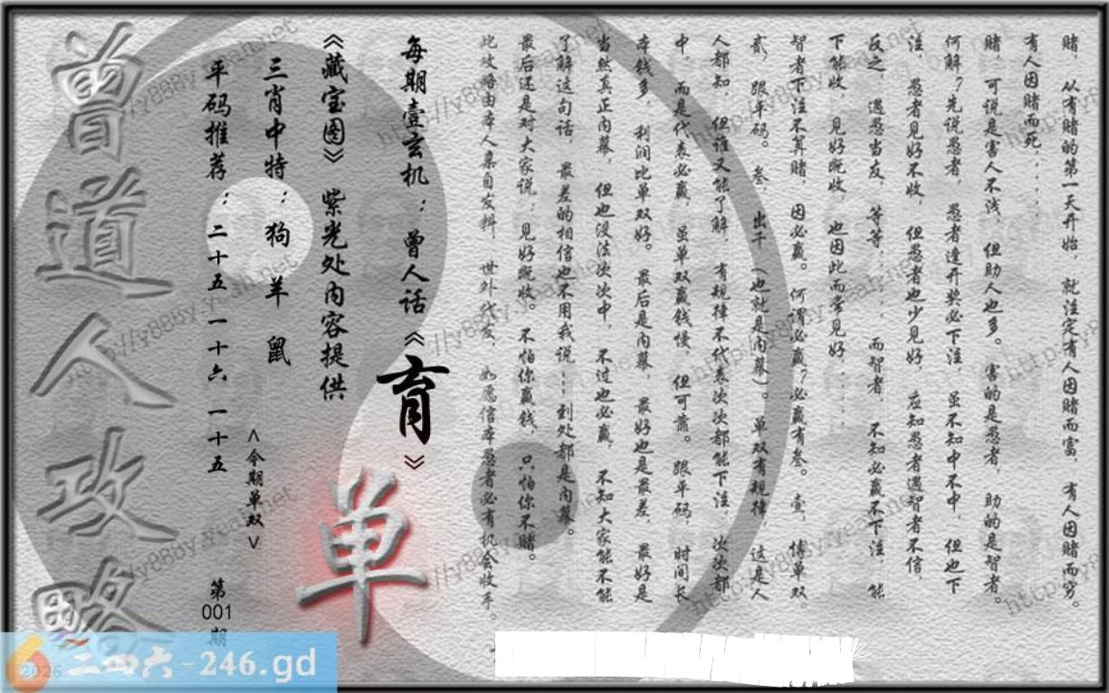 001期藏寶圖 新:郊外黄垓端可厌 老:晴街春色香车立 禁:虎 禁:0尾 玄機字:《育》