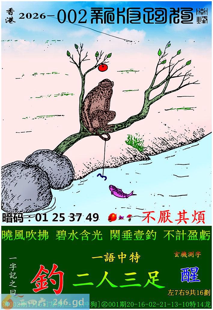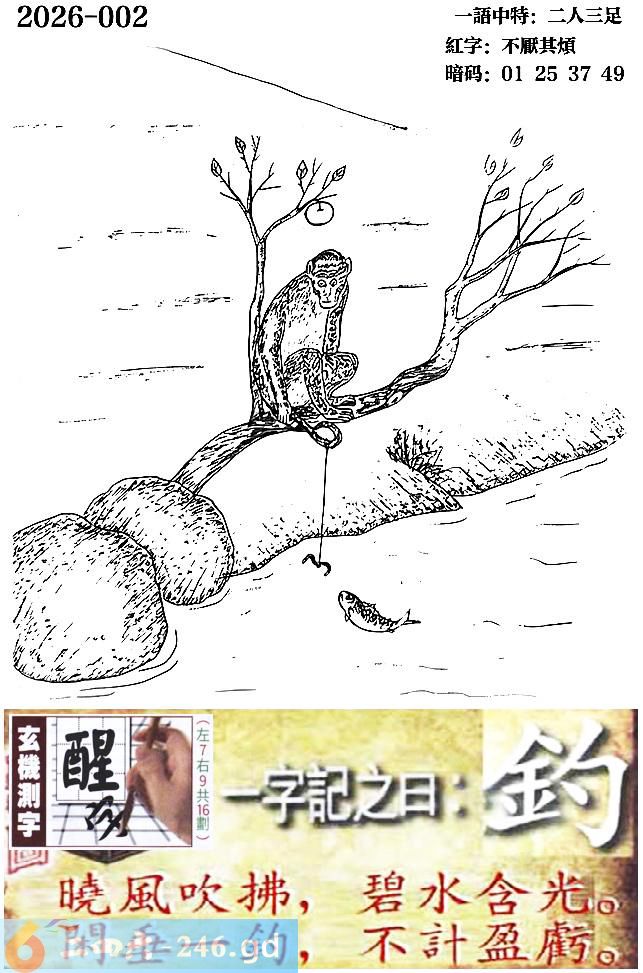002期跑狗一字記之曰:【釣】 曉風吹拂,碧水含光。 閑垂壹釣,不計盈虧。 玄機測字:《醒》 一語中特:二人三足