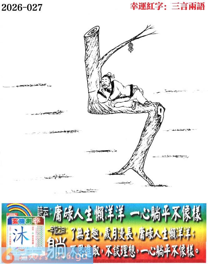 027期老版跑狗一字記之曰:【躺】 詩雲:庸碌人生懶洋洋,一心躺平不像樣。 了無生趣,歲月漫長,庸碌人生懶洋洋; 不思進取,不談理想,一心躺平不像樣。 玄機測字:《沐》