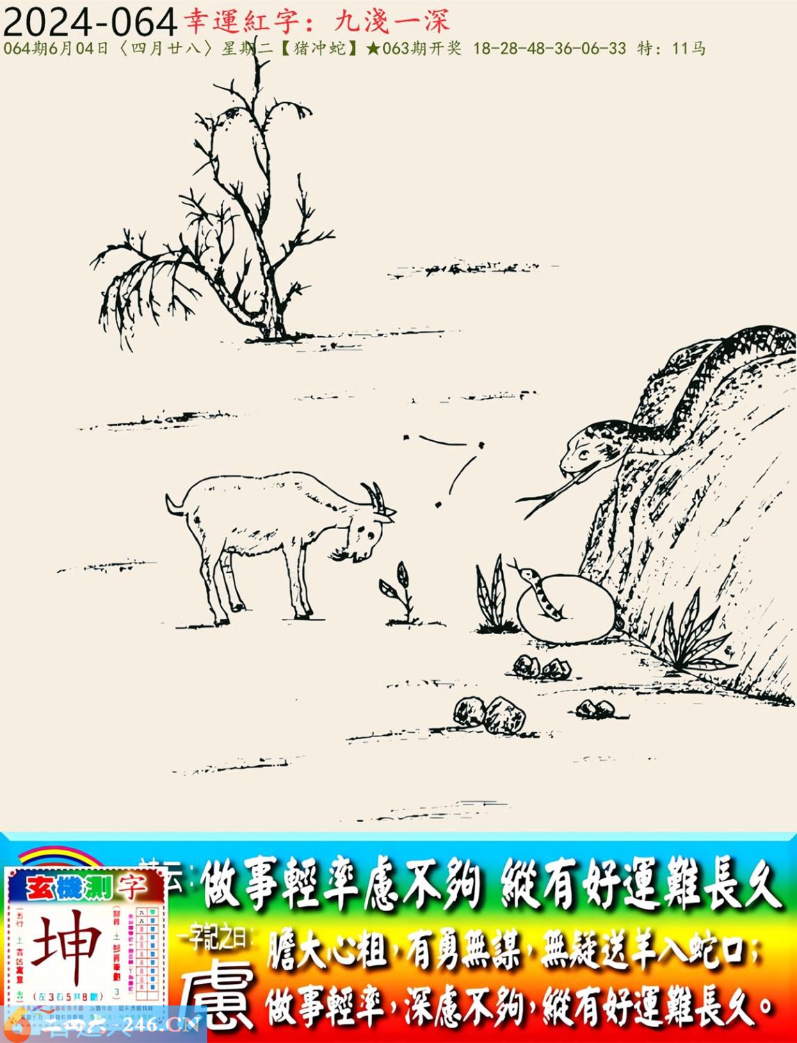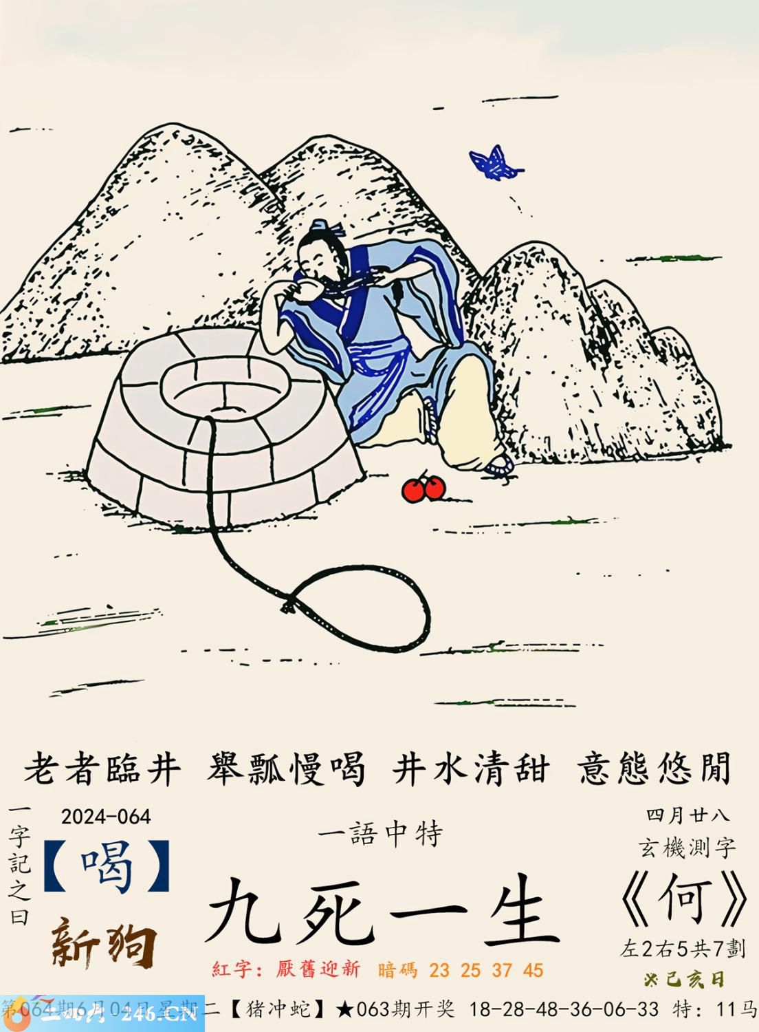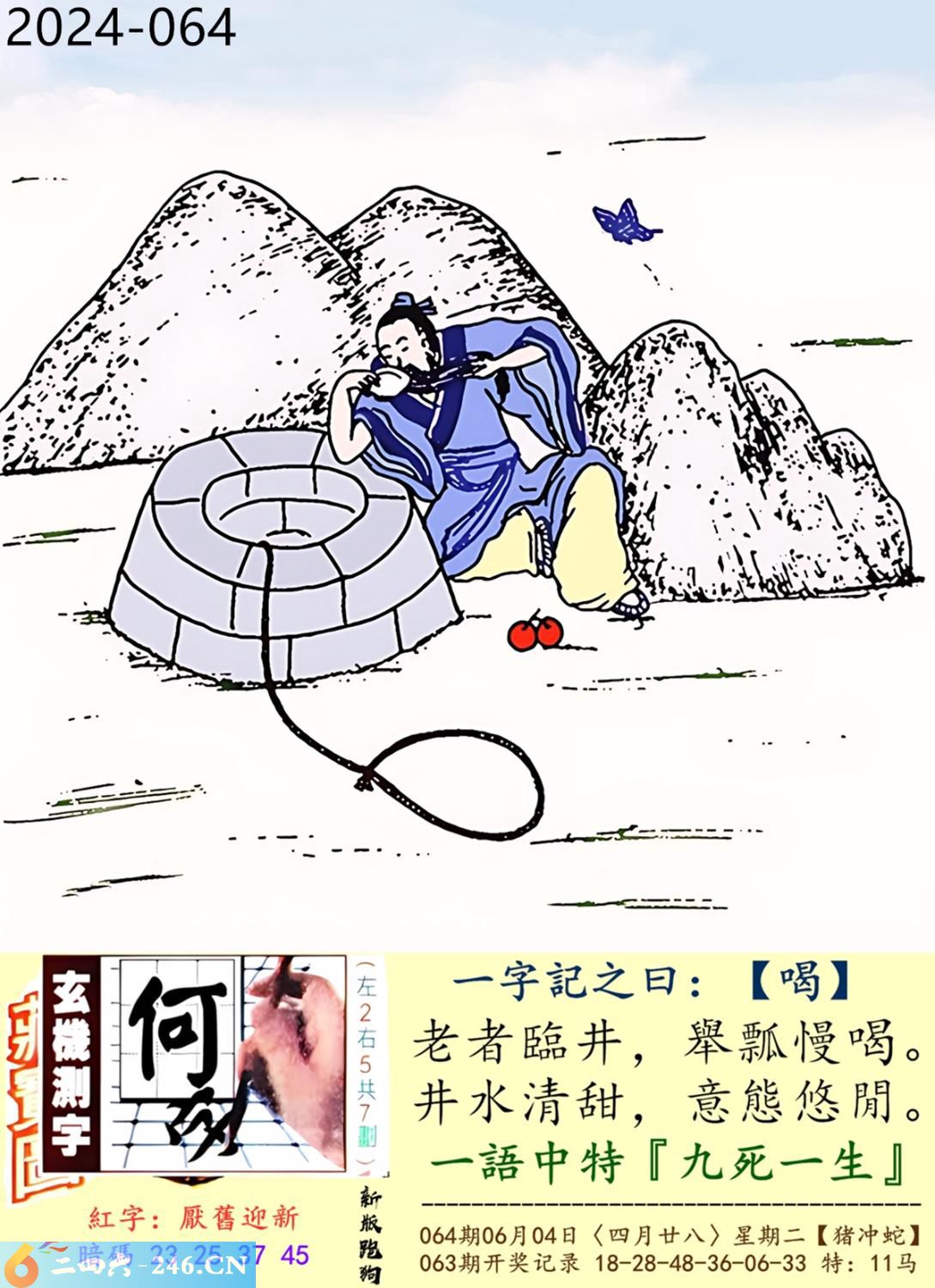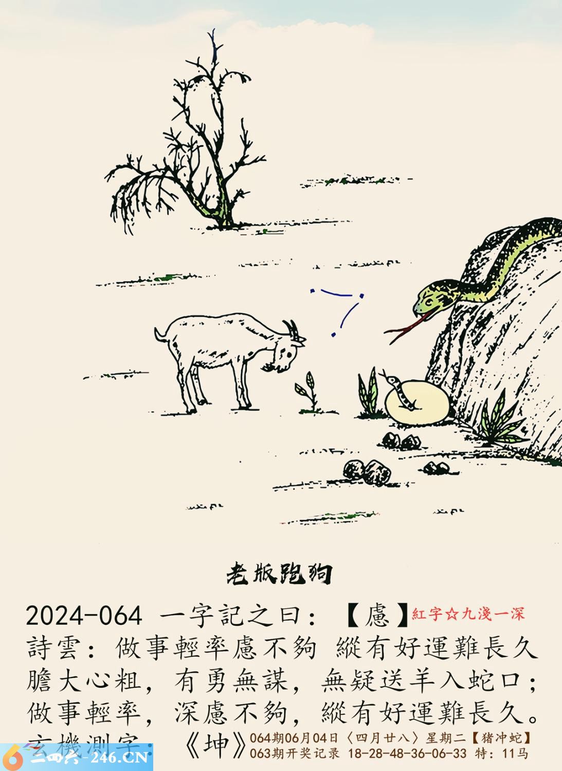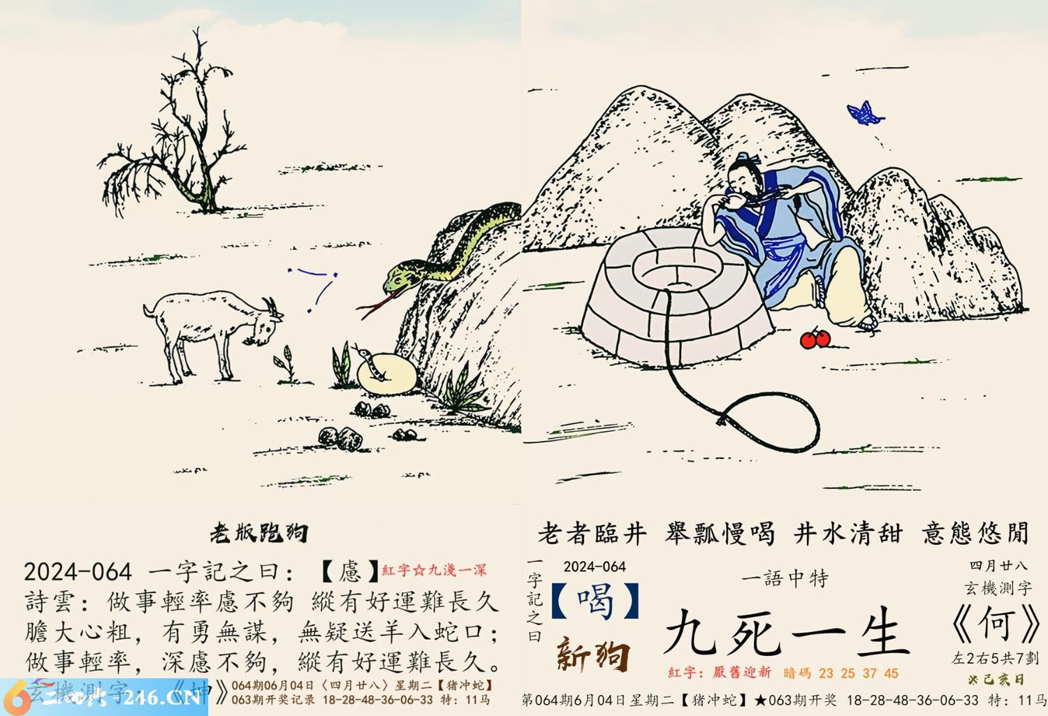 2024年6月4日064期猪日冲(癸巳)蛇(平地木) 064期:老版跑狗玄機一字記之曰:【慮】 詩云:做事輕率慮不夠縱有好運難長久 膽大心粗,有勇無謀,無疑送羊入蛇口; 做事輕率,深慮不夠,縱有好運難長久。 玄機測字:《坤》 密圖詩:左邊不是右邊是 記:山上拾柴烤兔子 特碼大小單雙句:一腳登天是神仙 今期必中:孫尚香 064期:特碼歇后語 酒里下了蒙汗药-----存心害人 064期四字梅花诗:尊老爱幼 064期火车头:烧伤马。诗:鸡死猴伤,一心两用必误事。 064期香港第一手欲钱料:龙。 064期曾道人说:“子?” 064期另版四字梅花:三长两短。 064期香港第一手欲钱料:欲钱找中国茅台酒。 064曾道人说:“为什么女人爱烫发?” 064期:二字经:蛋糕 064期:夏至是特码 064期:智力金壤:历历在目 064期:信箱紅字:【厭舊迎新】 064期:【暗碼:23-25-37-45】 064期:一語中特:【九死一生】 發財玄機圖:東倒西歪謀定後動圖中明蛇蓝紅 064期藏寳圖 新:且货乌金混世流 老:草满池溏水满陂 禁:猪禁:8尾玄機字《区》 2024年064期【生活幽默】版 〖隠居的禪師〗 青年跋涉深山,歷經險阻,終於找到了隱居山中的禪師,他迫不及待的問道:“我長得醜,我還怎麼辦?” “長得醜就應該像我一樣”禪師說道。 青年點點頭道:“心如止水,獨善其身?” “不,長得醜就應該像我一樣,找個深山躲起來。”